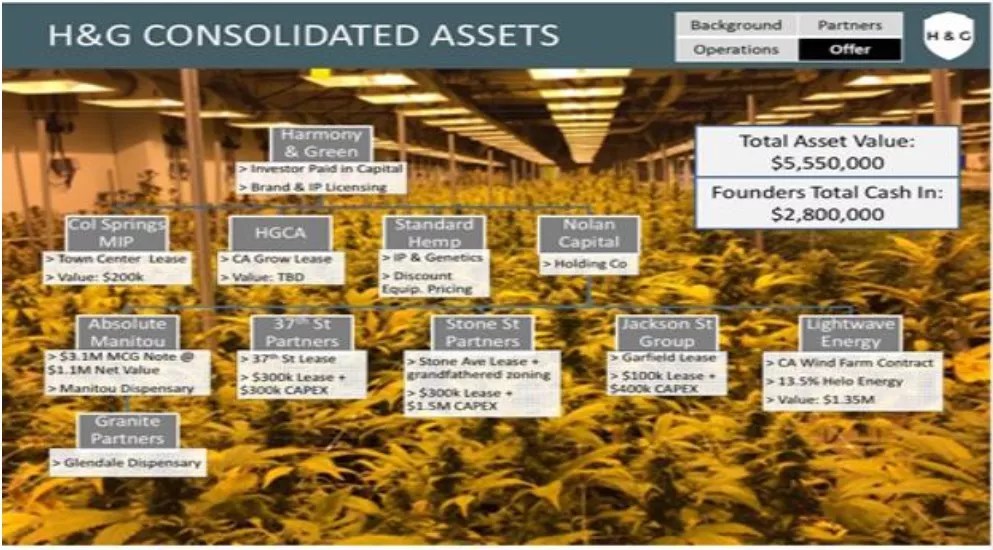 Update: As noted above, Scott Pack reached out to us after the publication of this post to share graphics provided to potential investors in Harmony & Green LLC, including Pierre Raygot. As he points out, the slides make it clear which entity holds the investment and which one holds the licenses (HGCO LLC).