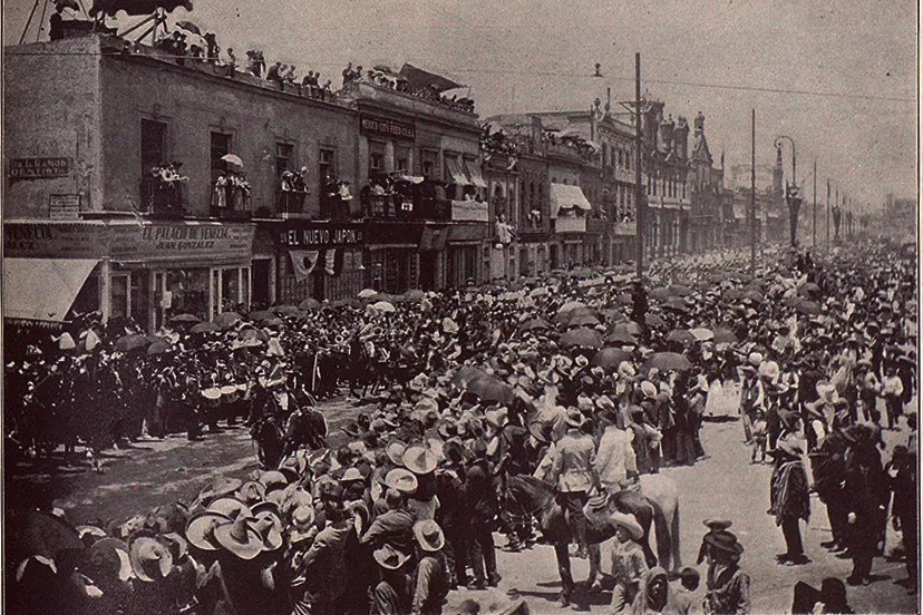 A crowd gathers in Mexico City to watch a military parade on Cinco de Mayo during the dictatorship of Porfirio DÃaz.