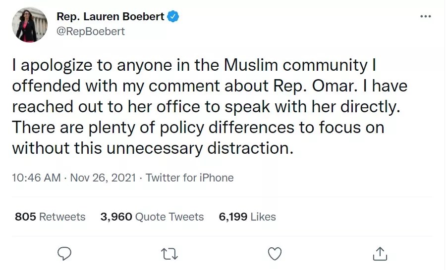 Later on November 29, the Council on American-Islamic Relations called for a censure of Boebert, essentially for all of the above. “Enough is enough,” said CAIR Director of Government Affairs Robert McCaw. “Accusing one of the first American Muslim women elected to Congress of being un-American and sympathizing with terrorists is a disgusting new low for Representative Boebert. Republican leaders of Congress, starting with Republican House Minority Leader Kevin McCarthy, must condemn this bigotry and demand that Representative Boebert immediately, clearly and publicly apologize. If she once again refuses to do so, Speaker Pelosi and Leader Hoyer should move to censure her. Failing to do so would signal that Islamophobia is an acceptable form of bigotry in the halls of Congress.”