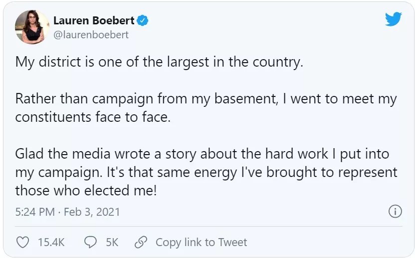 But as members of the media have pointed out, Boebert’s predecessor, Republican Scott Tipton, represented the same territory in Congress — which he perhaps needed to travel a little more if he wanted to secure the primary nomination in 2020. Tipton was reimbursed $12,255 for all expenses accumulated over his five two-year terms; Boebert claimed almost twice that much for just eight months.