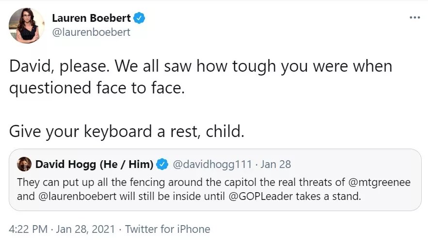 The silence from those Republican reps stood in stark contrast to the activity coming out of Boebert’s office; even though her communications director had resigned less than a week into the session, the press releases kept flying…and Boebert kept tweeting. On January 27, she delivered this barb to David Hogg, survivor of the 2018 school shooting in Parkland, Florida, via tweet: