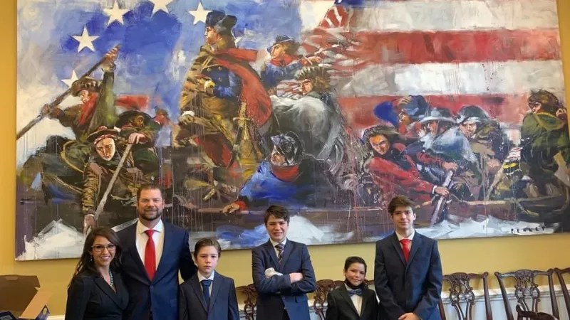 Representative Lauren Boebert and her family pose before a painting that honors the Revolutionary War to celebrate her congressional swearing in.