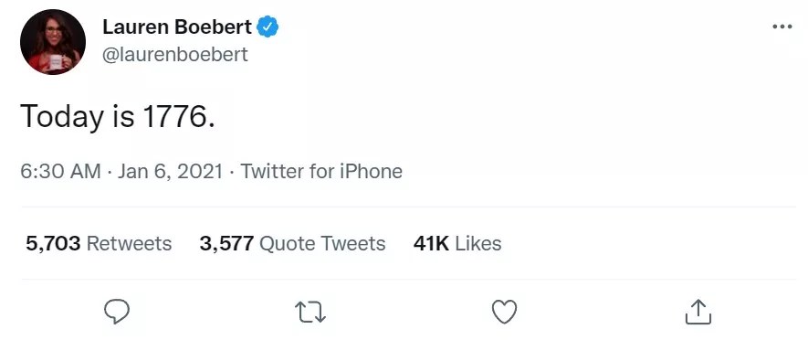 Boebert tweeted this on MLK Day, at the same time she was standing with the rest of the GOP and refusing to support the John Lewis Voting Rights Advancement Act. But yes, the relentless pursuit of freedom should be living on in all of us. Here’s hoping that she — and the rest of the modern Republican Party — actually comes to believe that, and soon.