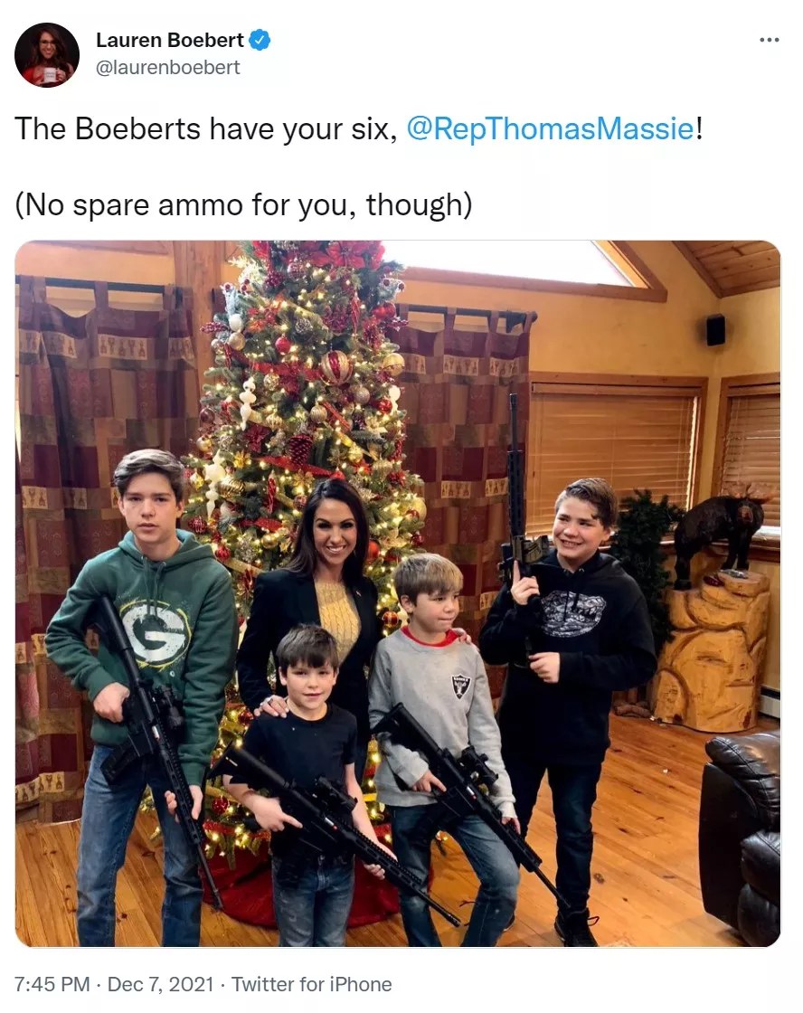 This tweet was in response to fellow Representative Thomas Massie, who only days after a Michigan teen killed four and wounded seven — in yet another of the school shootings that have tragically become so endemic to America — posted a Christmas card with the whole family grinning and carrying assault weapons. Massie’s Christmas wish was ghoulish enough; Boebert riding his bloodstained coattails by posting a heavily armed holiday wish with her own kids was just head-shakingly pathetic. Seriously, Republicans: Stop trying to ruin Christmas.