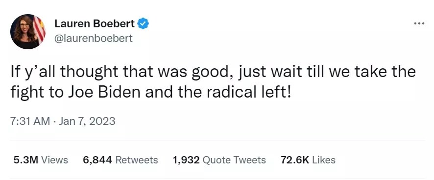 And then, true to form, Boebert attempted to close the matter with a logic-torturing tweet. “If y’all thought that was good,” she posted early on January 7, “just wait till we take the fight to Joe Biden and the radical left!”