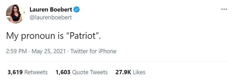 Well, no, it’s not, because “patriot” is a noun, and grammar is a thing. But sure, in the interests of English vernacular being a living language that embraces change, let’s try it out: Representative Lauren Boebert tweeted today patriot’s preferred pronoun; patriot unfortunately chose a word that wasn’t a pronoun, which made patriot sort of look like a moron. What’s up with patriot, many of patriot’s constituents may ask? It’s a fine question, voters of CD3, and one you should consider carefully when patriot runs for re-election.
