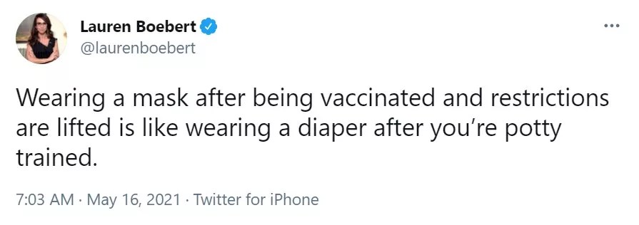 Boebert is about as good with a simile as she is with pronouns, but this comparison is accidentally apt. As a mom of four, she knows that potty training is a process. It takes time to move from diapers to the big-girl potty — much like it takes time in the hopefully waning days of a pandemic to move from mask-wearing to the world as we knew it before. Then again, the process of being elected to Congress is usually more of a process, so her belief in instant gratification is understandable.