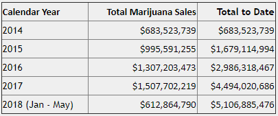 Total revenue collected from legal cannabis sales in Colorado fell again in May, according to Colorado Department of Revenue data. Legal pot sales accounted for about $122.9 million in May, DOR records show, slipping over $1.4 million from April’s total and dipping slightly below sales in May 2017.