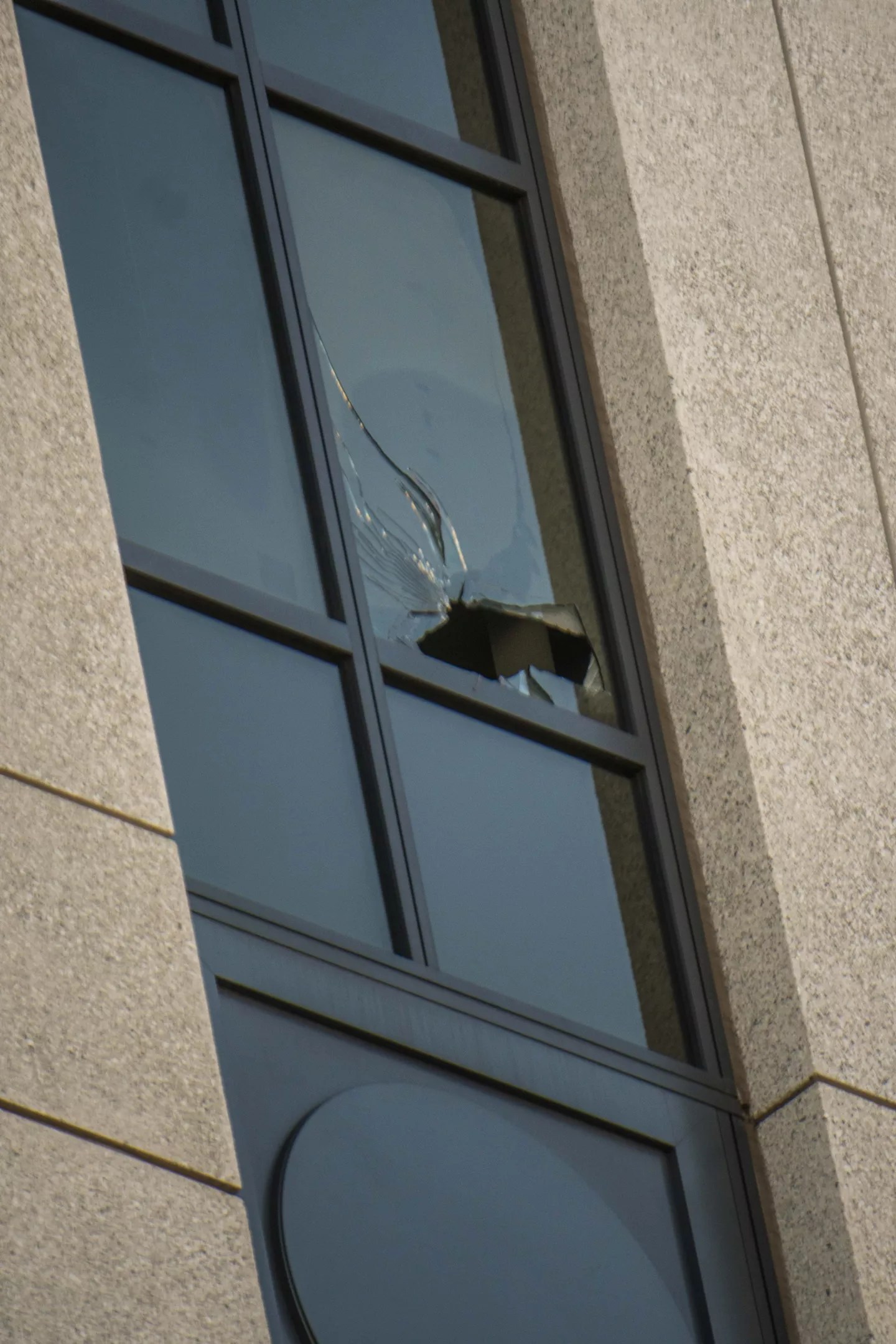 A broken window on the seventh floor, visible from the street below.
