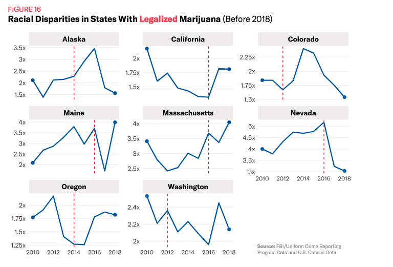States early to legalize marijuana – Colorado, Alaska, California, Oregon and Washington – were in the bottom ten for racial disparity, according to the ACLU. But Colorado, Alaska, Oregon and California actually saw initial rises in racial disparity after legalization, the data shows, though Colorado and Alaska have since seen drops to lower numbers than in pre-legalization years.