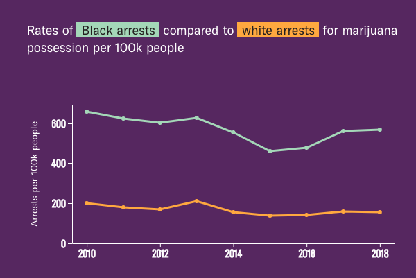 The ACLU’s recent report examines arrests of both whites and blacks for marijuana possession from 2010 to 2018, compiling data across the country, and comparing statistics for every 100,000 people. The conclusion? Black people were about four times more likely to be arrested for possessing marijuana than white people.