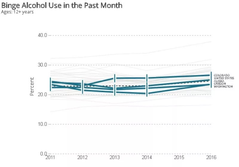 A similar scenario can be seen in Colorado regarding binge alcohol use in the past month. The numbers are higher than the national average but don’t mirror marijuana usage in any substantial way.