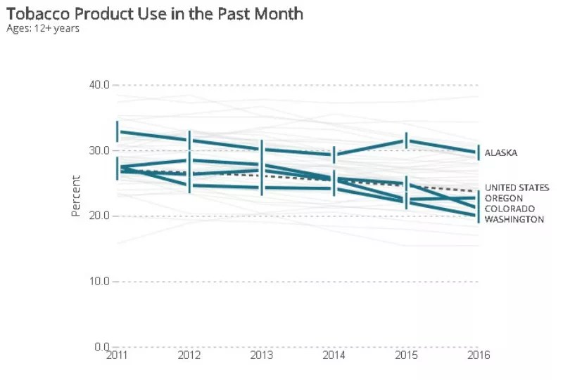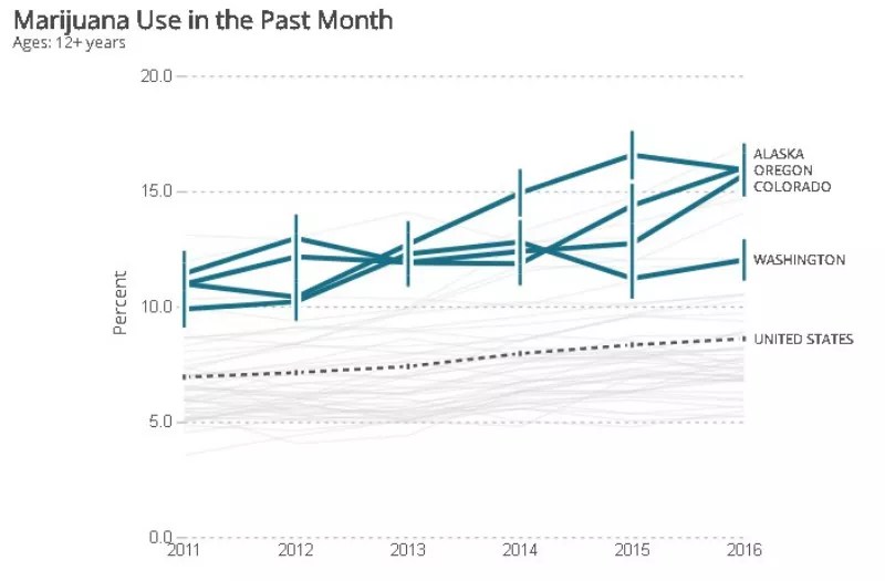 Specifically, the analysis looked at data from Colorado, Washington, Oregon and Alaska, all of which have legalized limited recreational marijuana sales, and then compared it to national averages. Data for the states was drawn from the federal Substance Abuse and Mental Health Services Administration’s National Survey on Drug Use and Heath, and other sources include the Centers for Disease Control and Prevention’s Behavioral Risk Factor Surveillance System and the Bureau of Labor Statistics.