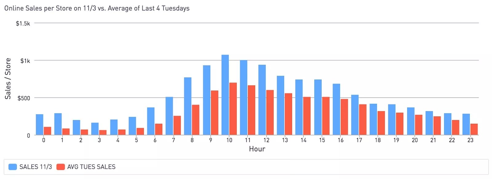 An hour-by-hour breakdown of e-commerce cannabis sales on election day, November 3, compared to average Tuesday sales.