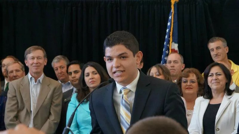 Marco Dorado speaking in 2013 at the signing of the ASSET bill, which granted in-state tution rates to all Colorado high-school graduates regardless of their immigration status. His audience includes Governor John Hickenlooper, legislators Crisanta Duran and Angela Giron and former Denver Nuggets great turned broadcaster Bill Hanzlik.