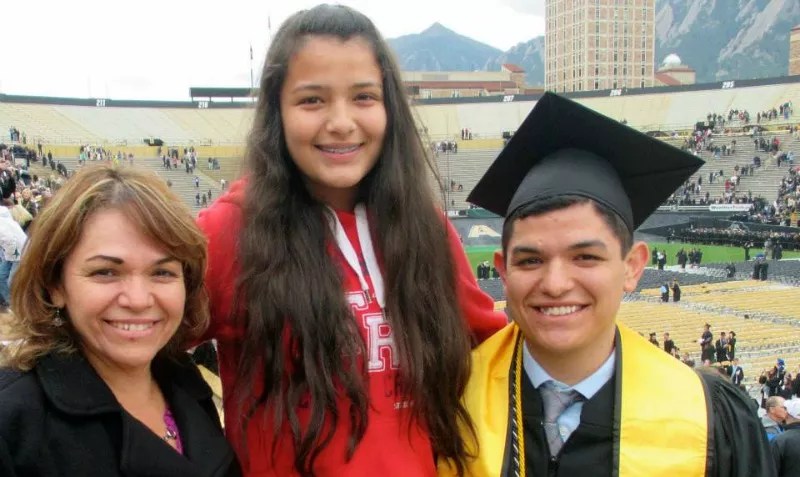 Marco Dorado with his mother and younger sister at his CU Boulder graduation.