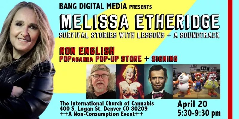 English will talk about his “POPaganda” work (combining fine art with advertising and brand imagery), debut a new art toy and sell some of his less-expensive pieces in a pop-up shop at the church, according to church co-founder Lee Molloy. And although he’s not promising that Etheridge – a vocal cannabis advocate after using the plant to counteract chemotherapy problems brought on by breast cancer – will perform, Molloy isn’t ruling it out, either.
