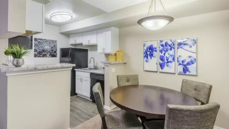 The kitchen and dining areas in the Aurora one-bedroom highlighted in the photo at the top of this post.