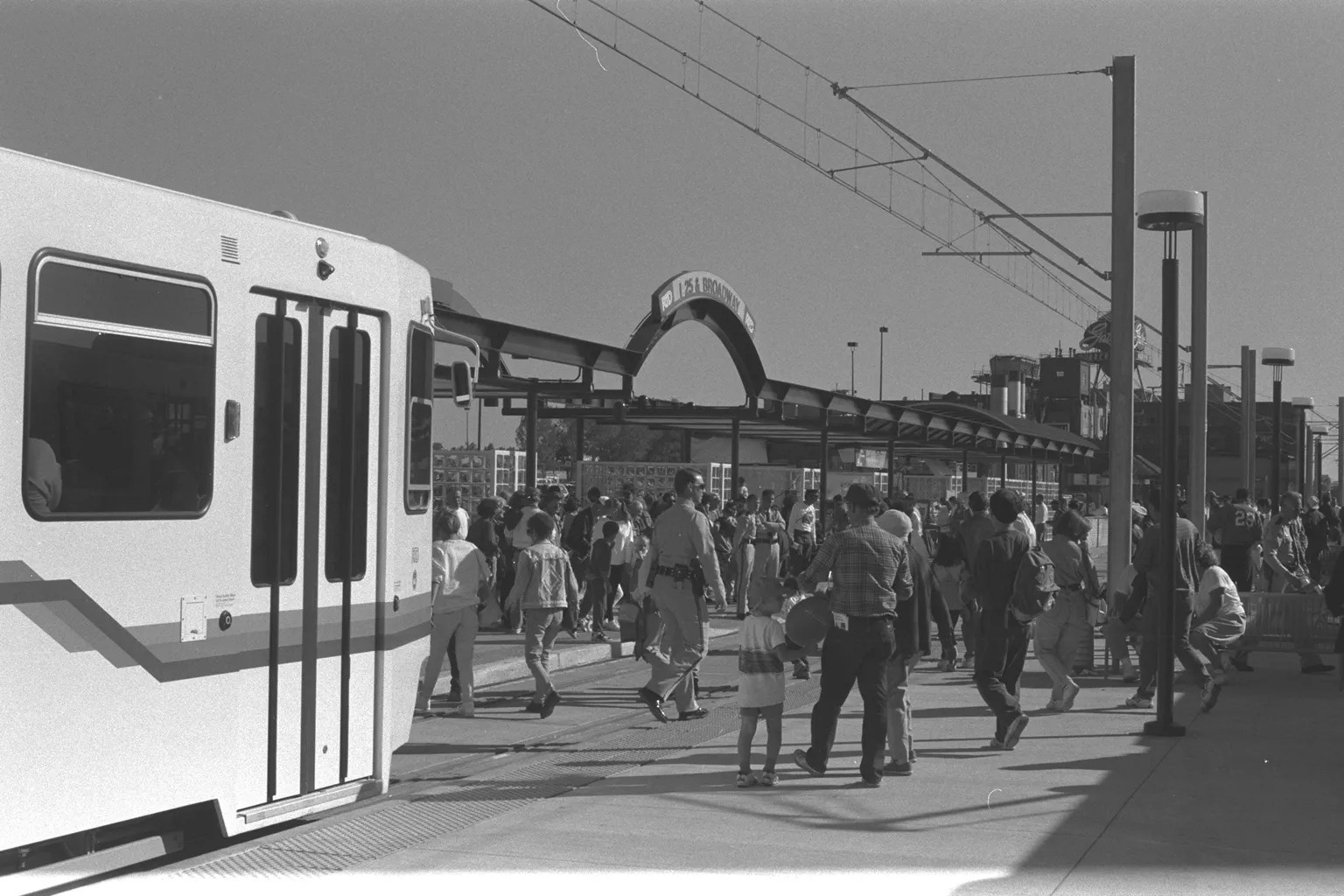“The public was so excited about it,” Hudson recalls. “In those opening days, there were tens of thousands of people who came down to ride the trains for the first time. … I was one of the people who would be on the trains to answer questions, and I spent all of two days just riding back and forth. There was this one section up near Tenth and Mariposa, where, when you looked out, there was this huge junkyard with all these scrapped cars. As we drove by there, I’d say, ‘If you look out the window to your right, that’s where we put all the cars that we’ve hit.'”