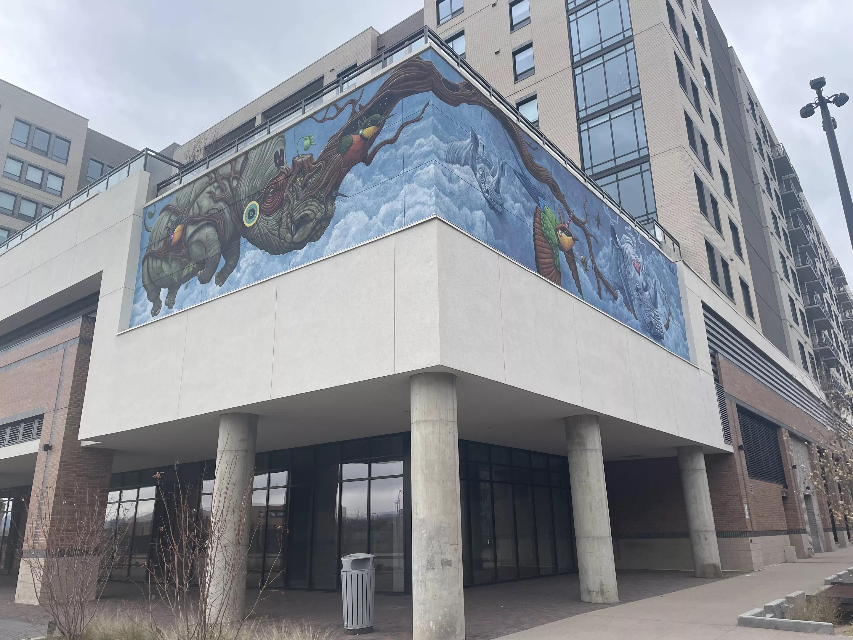 Just underneath the viewing deck is a mural that was part of this year’s Denver Walls festival, which depicts a rhinoceros with its horn transformed into a tree branch, along with other rhinos who are part of the clouds in the background.