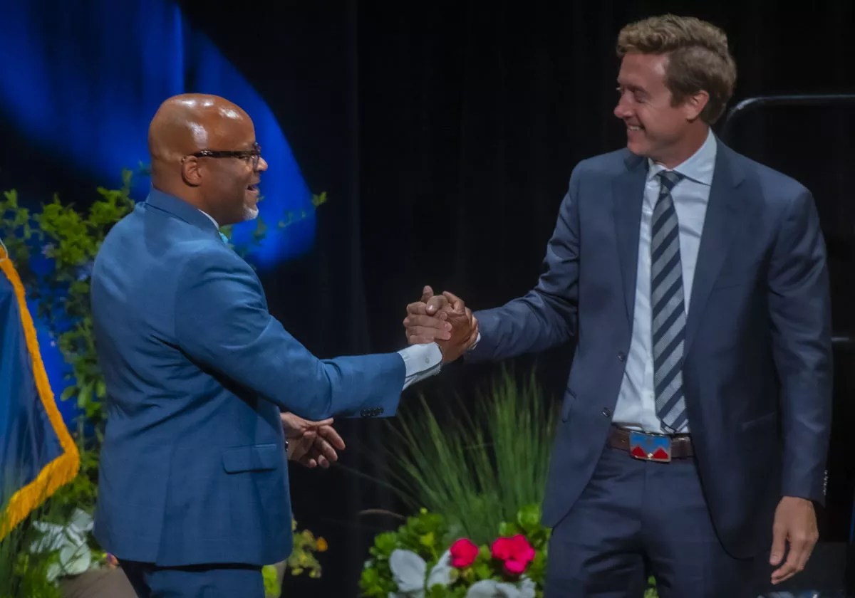 Michael Hancock, who’s leaving City Hall after three terms as mayor and two on city council, received a standing ovation and a hug from Johnston, who seemed eager to start his new job and ended his speech with “Now, let’s get to work!”