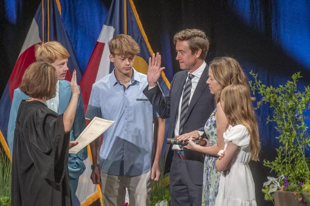 Mike Johnston surrounded by his family at the swearing-in ceremony.