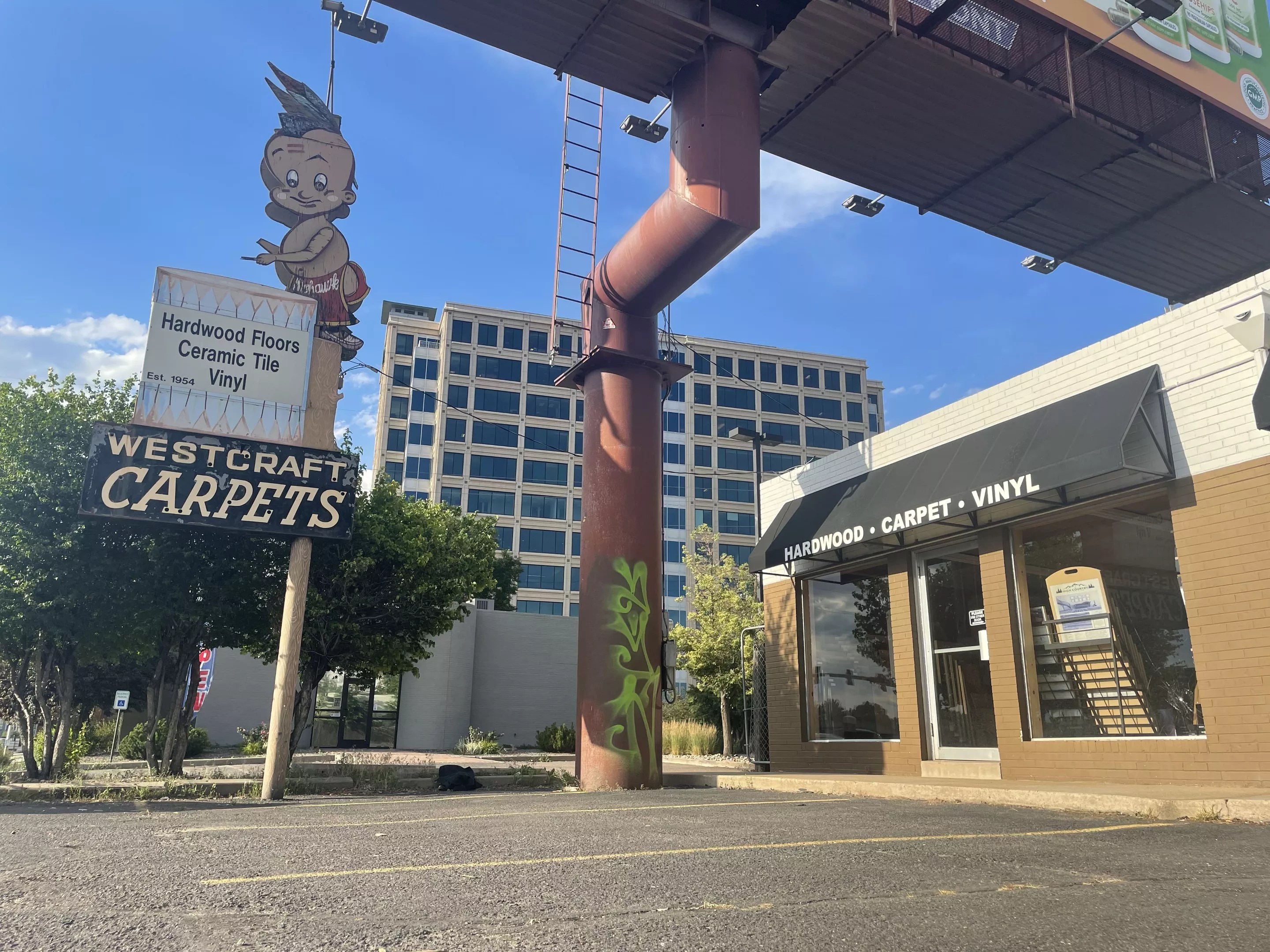 Mohawk Tommy, a shirtless boy sporting a mohawk haircut with a feather in back, was a 1950s Walt Disney Company cartoon creation that Mohawk Carpets — now Mohawk Industries — used in its advertising. You can still see the figure in dolls, drawings and even rugs available on eBay…and on that sign on South Colorado Boulevard.