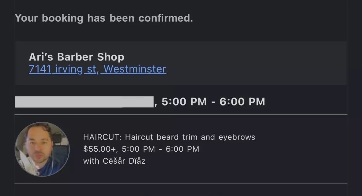 A Booksy confirmation email for a haircut appointment with Diaz. Date censored for privacy.