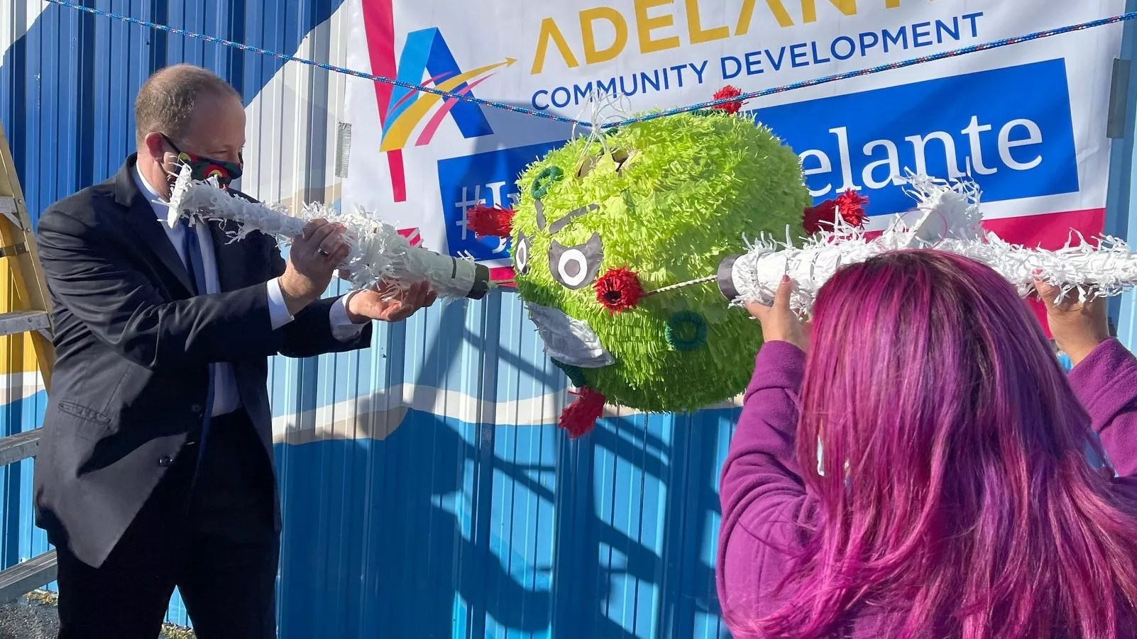 At a February 26 vaccination event, Governor Jared Polis jammed a faux-hypodermic into an angry-looking COVID-19 piñata.