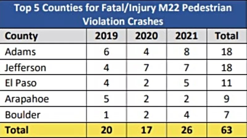 Here’s a CSP graphic showing the counties with the most fatal or injury crashes from 2019 to 2021 that fall into the M22 category; Trooper Joshua Lewis notes that M22 is a state patrol code for “pedestrian violation caused.” The tally is led by Adams and Jefferson counties, and both Arapahoe and Boulder counties also made the top five. The only county outside greater Denver in the lineup was El Paso, which includes Colorado Springs.