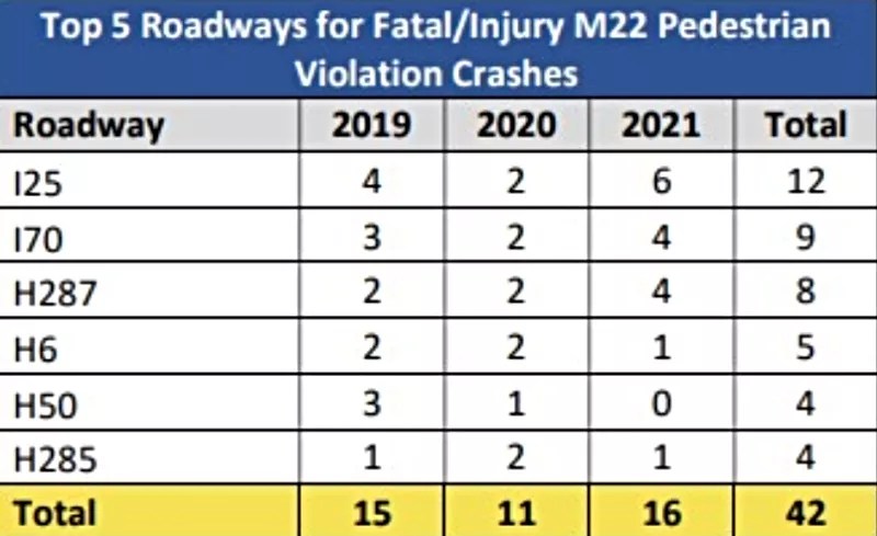 As for roadways with the most serious injury or fatal crashes involving pedestrians, the roster begins with Interstate 25, followed by Interstate 70, Highway 287, Highway 6, Highway 50 and Highway 285. Of these routes, only Highway 5, also known as the Mount Evans Highway, isn’t regularly used by metro Denver commuters.