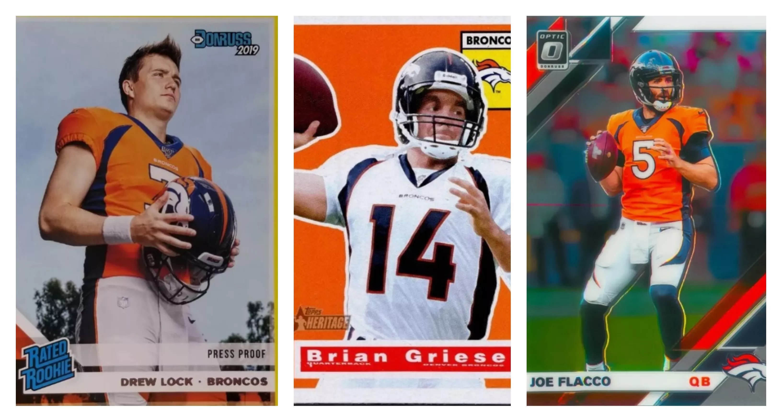 Trading card images of former Broncos Drew Lock, Brian Griese and Joe Flacco.