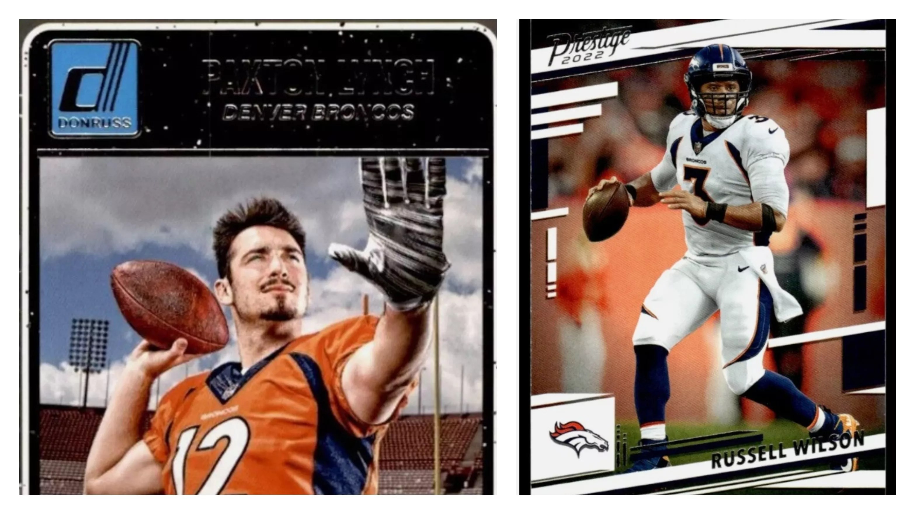 Trading card images of former Broncos Paxton Lynch and Russell Wilson.