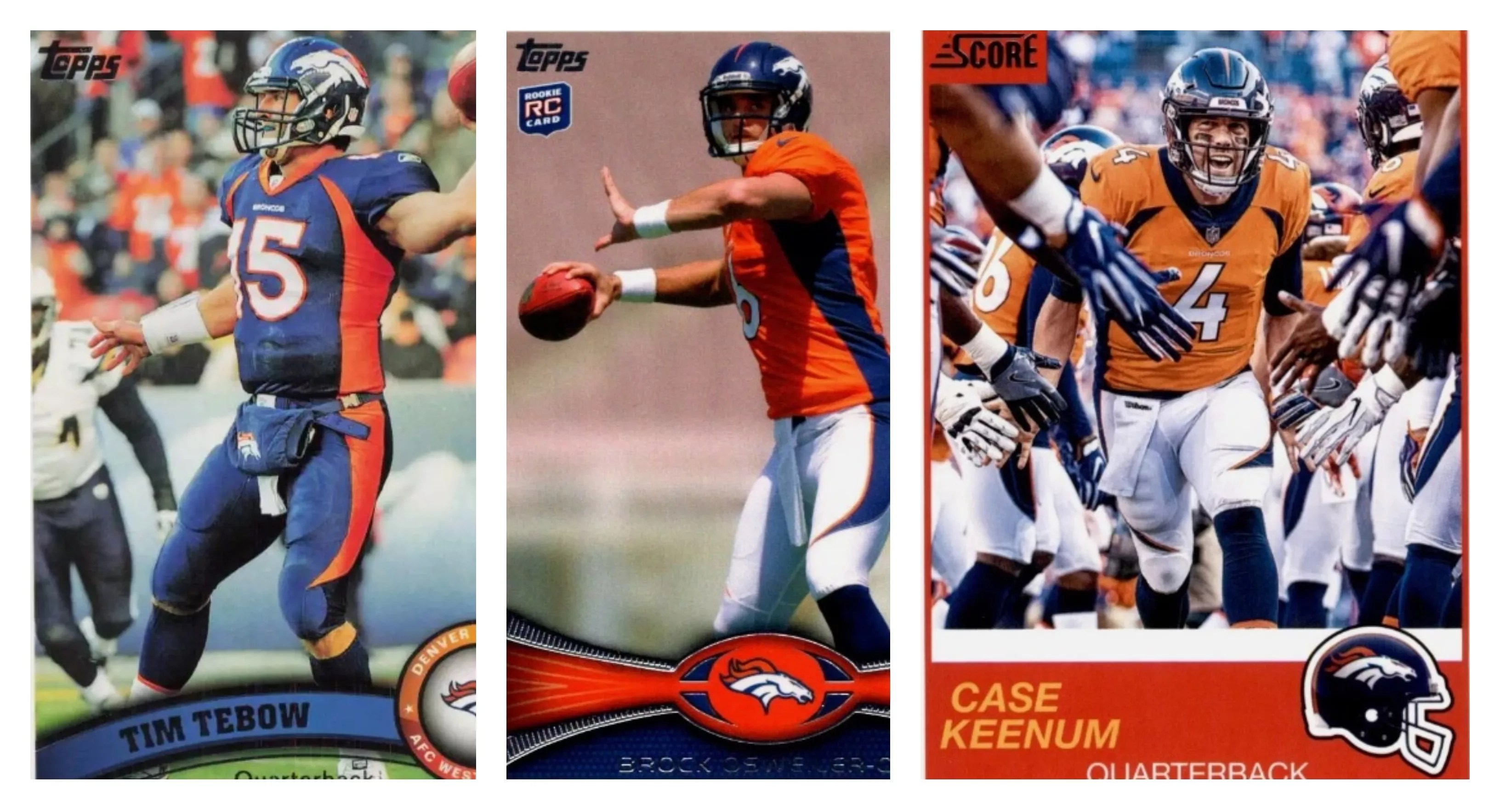 Trading card images of former Broncos Tim Tebow, Brock Osweiler and Case Keenum.