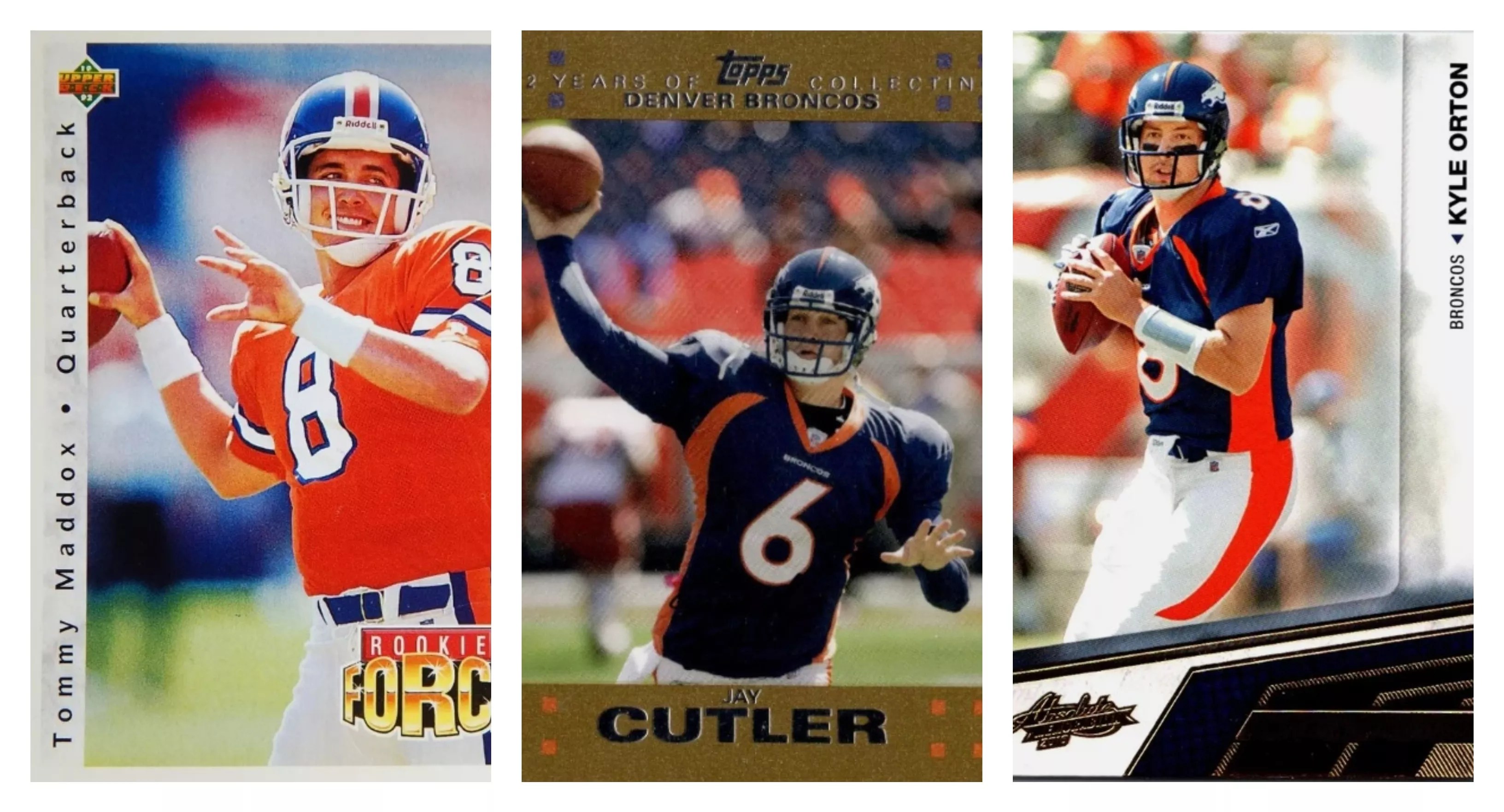 Trading card images of former Broncos Tommy Maddox, Jay Cutler and Kyle Orton.