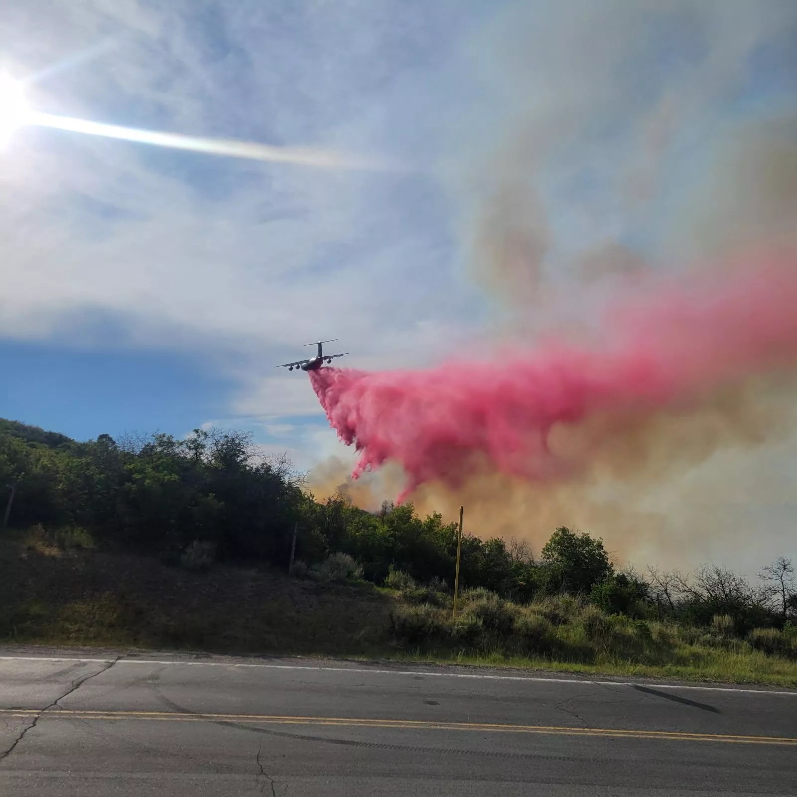 Firefighters drop retardant on the South Rim fire on July 12, 2025.