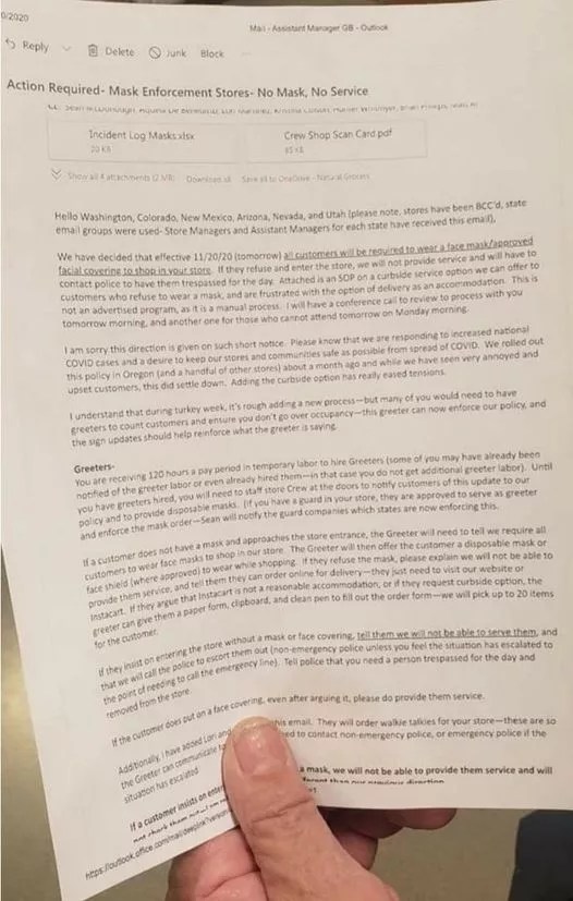 After our original piece was published, Schlossberg obtained a copy of an internal memo addressed to Natural Grocers stores in Washington, Colorado, New Mexico, Arizona, New Mexico and Utah. The document, seen at left, states in part: “We have declared that effective 11/20/2020 (tomorrow), all customers will be required to wear a face mask/approved facial covering to shop in your store. If they refuse and enter the store, we will not provide service and will have to contact police to have them trespassed for the day.”