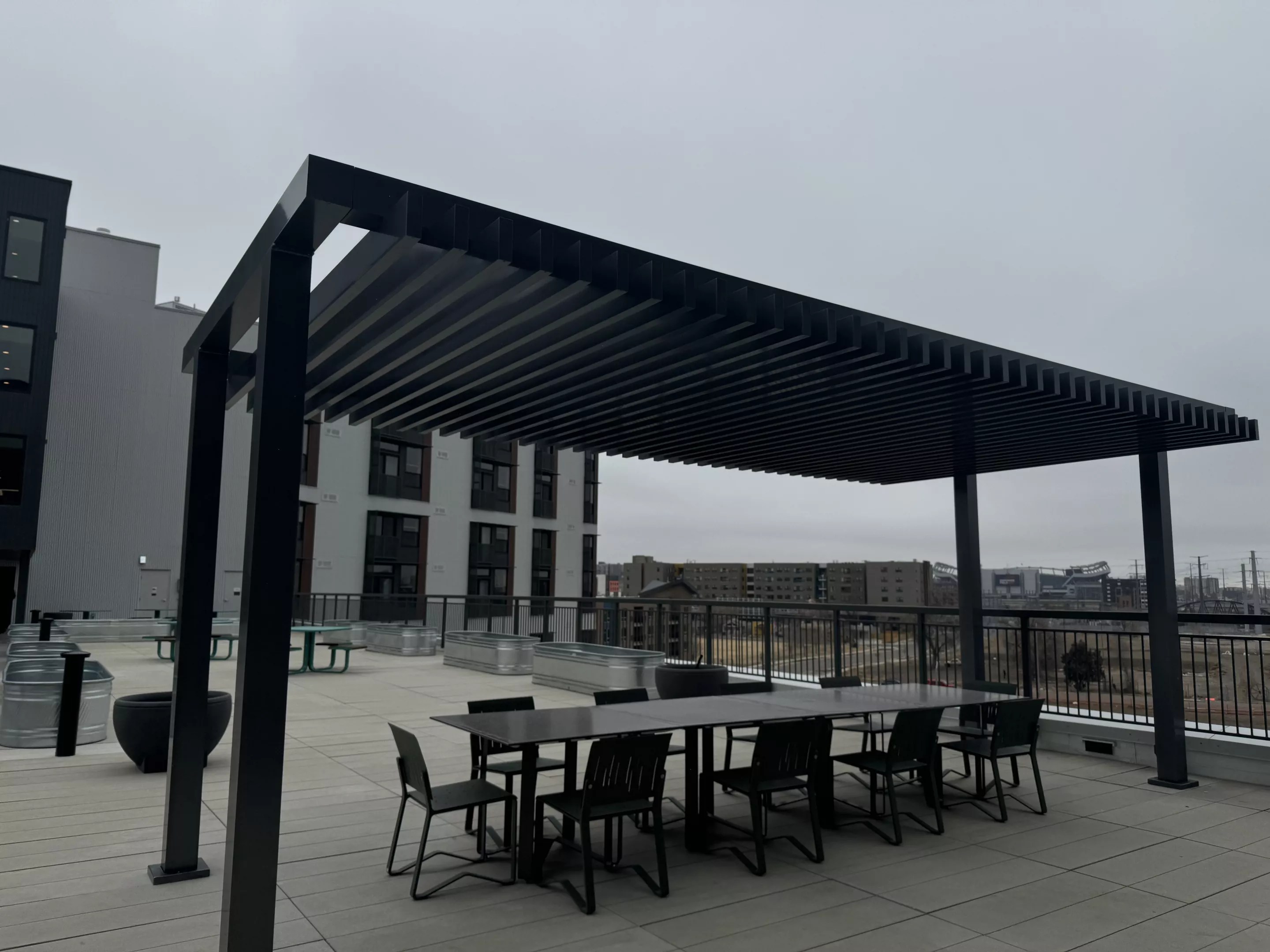 Joli’s outdoor community space offers a view of the Broncos stadium.