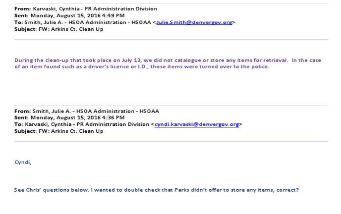 In an e-mail thread discussing how to answer questions sent by Westword last year about the sweeps, Parks and Rec spokeswoman Cyndi Karvaski wrote to Department of Human Services spokeswoman Julie Smith: “During the clean-up that took place on July 13, we did not catalogue or store any items for retrieval. In the case of an item found such as a driver’s license or I.D., those items were turned over to the police.”