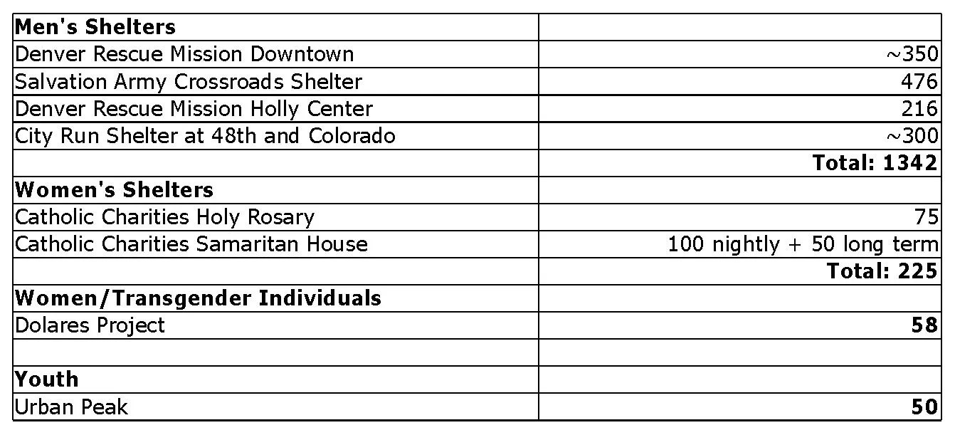 The last “point in time” survey of individuals experiencing homelessness, conducted in January 2017, found that there were 5,116 homeless individuals in metro Denver. Of those, 1,039 were deemed “chronically homeless,” meaning that they were living in spaces deemed unfit for habitation and had been homeless for at least a year. These individuals tend to require shelter most frequently during the winter.