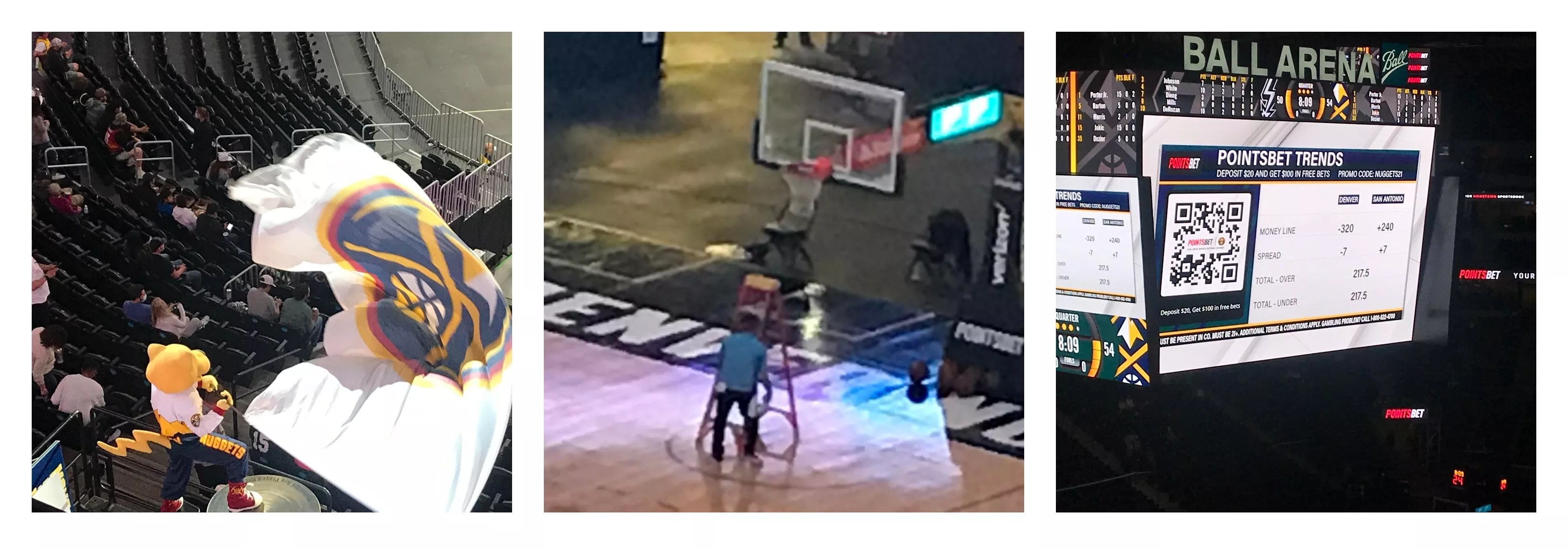 Otherwise, the Ball Arena staff went the extra mile to keep the venue as clean as possible. Lora visited the bathroom twice, and each time, an employee was on hand to sanitize immediately afterward. At halftime, another crew member sanitized the rims and backboards on the court — which at least gave attendees something to watch. Instead of highlighting dancers, games between junior basketballers, special guest performers or the like, the gap between the second and third quarters was filled by video of DJ Paws spinning vinyl and random folks dancing near their seats, plus aggressive advertising for PointsBet, the Nuggets’ gambling partner.