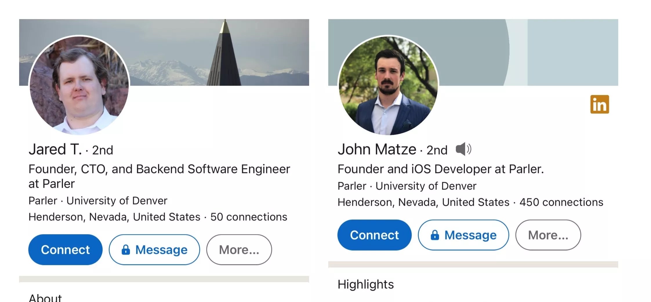 The LinkedIn profiles of Parler founders Jared Thomson and John Matze.