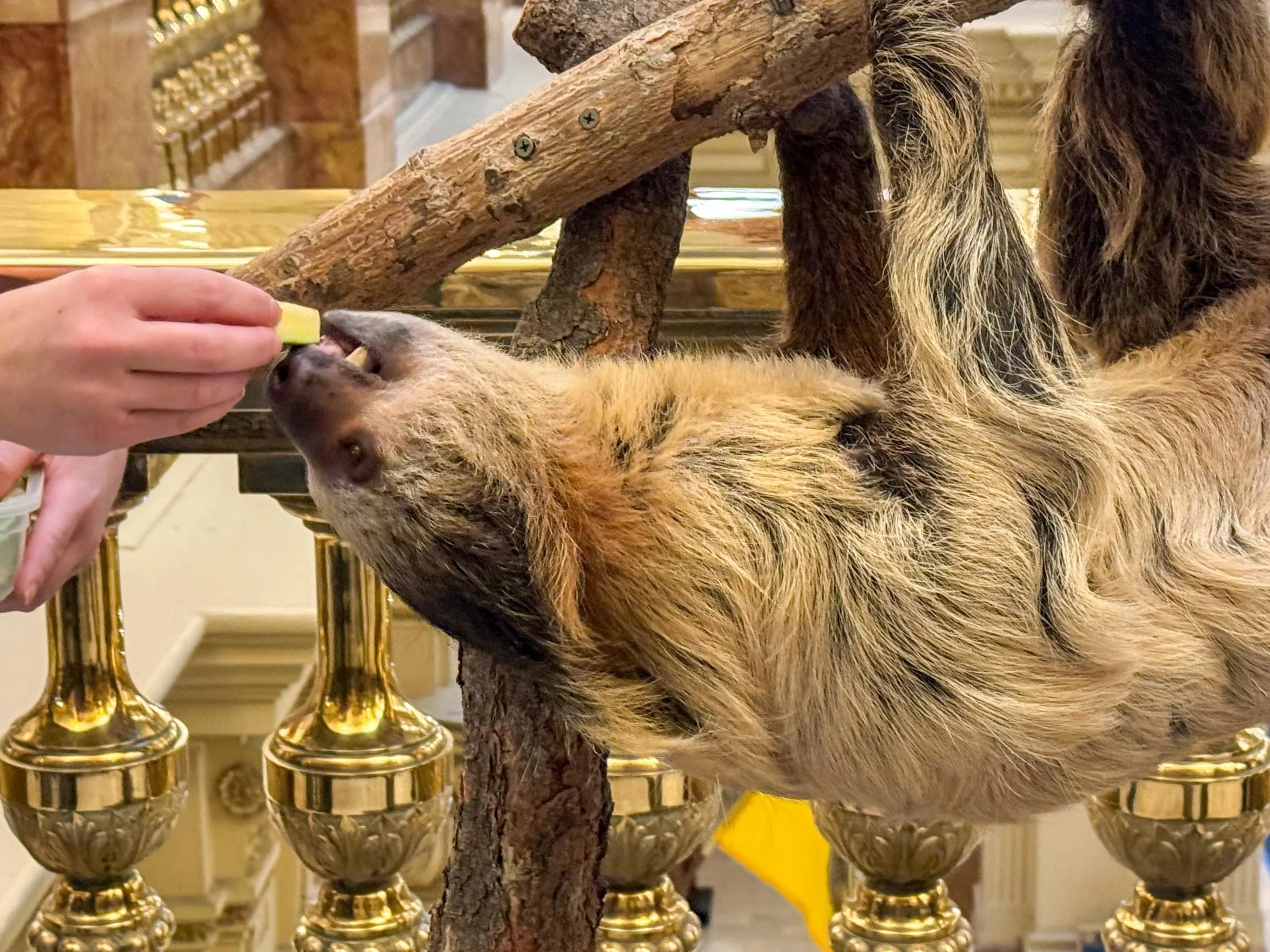 Wookiee the Linne’s two-toed sloth lounging at the Capitol on March 1.