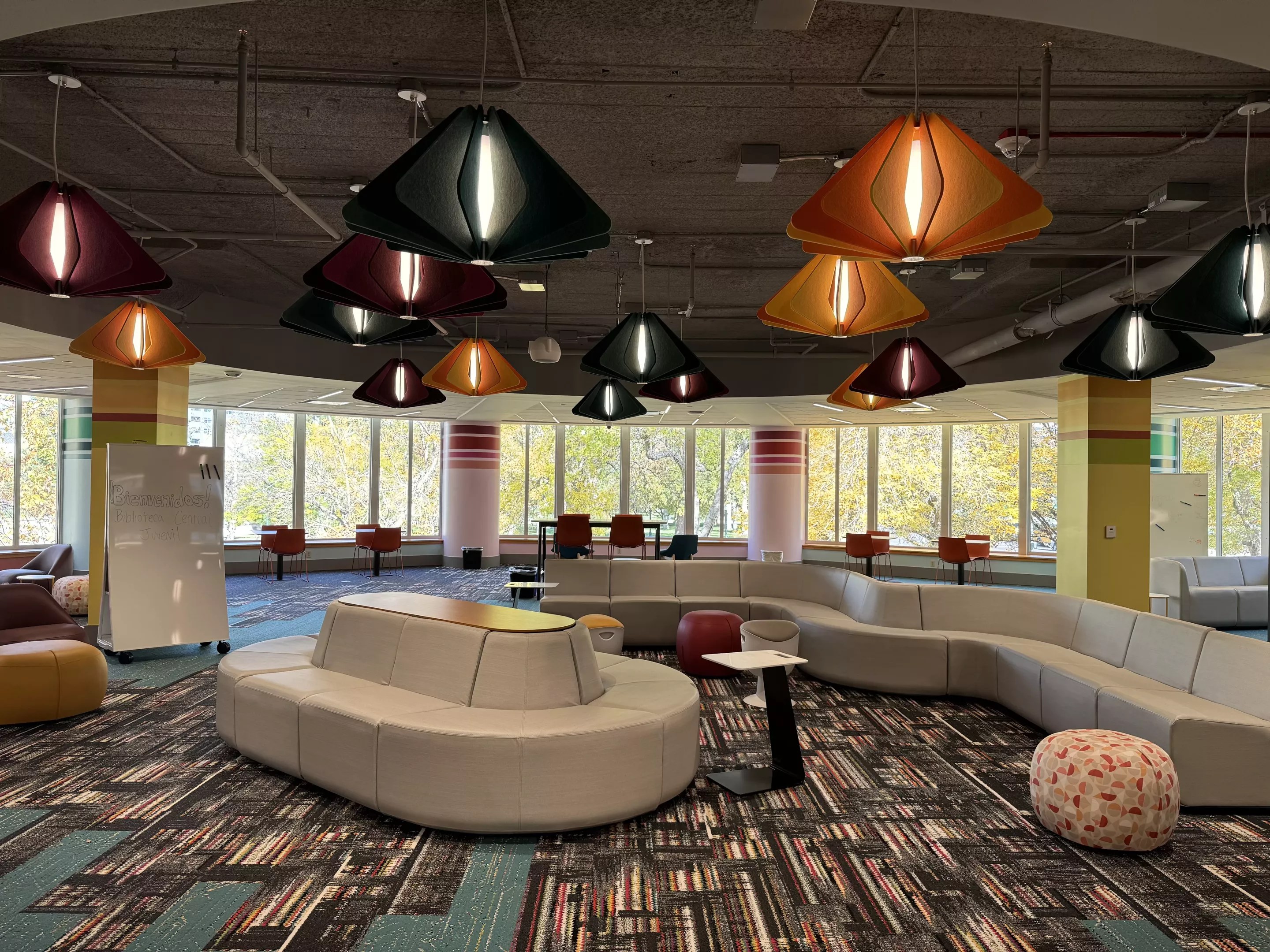 The renovation removed antiquated escalators that were hard to keep operating, replacing them with a new grand staircase system in the library’s main atrium, Schlessman Hall. The entrances are more open, with a clearer view of where the circulation desk is; holds and returns are also central to the new main hall.