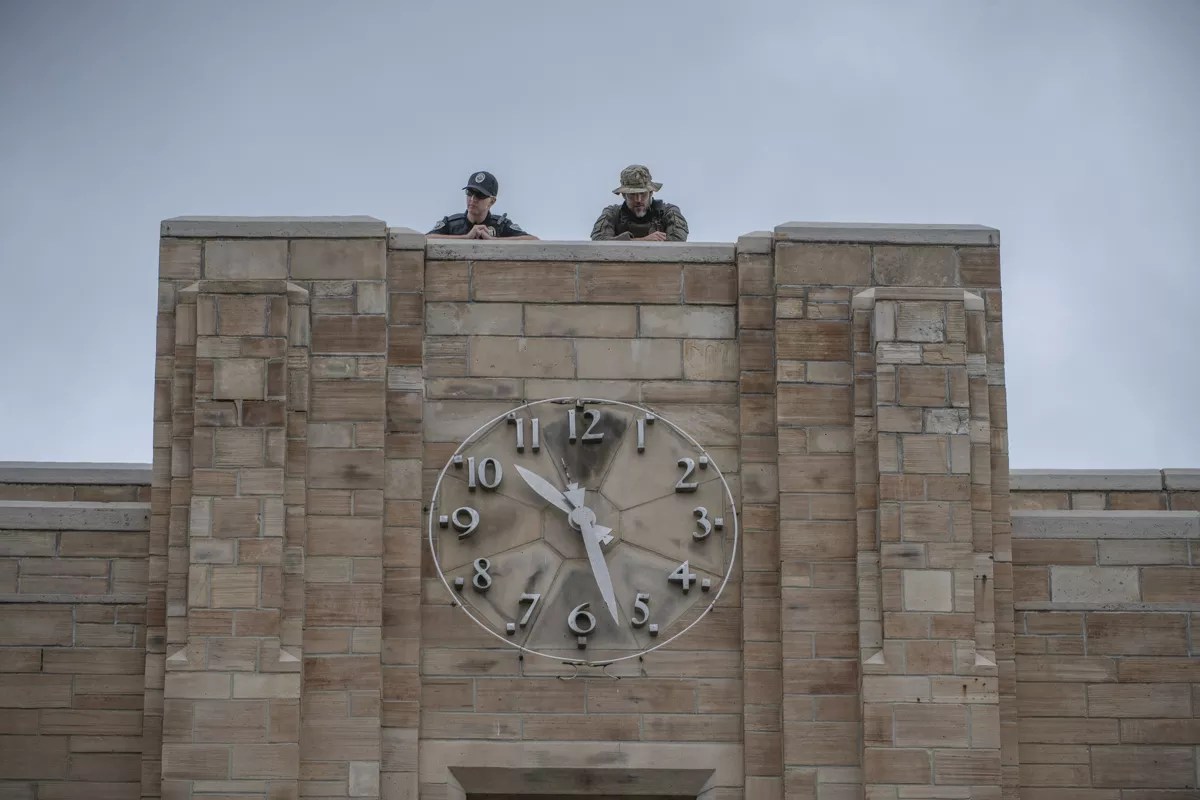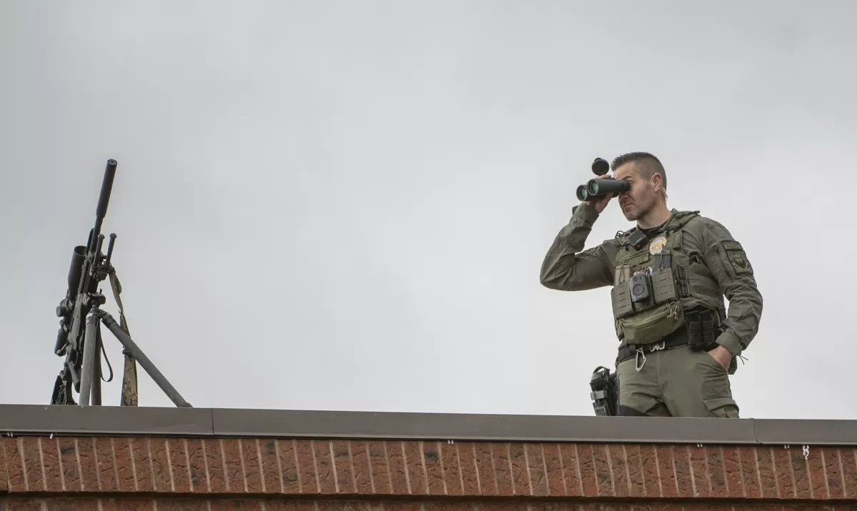 Boulder County SWAT perch high above Pearl Street on top of the historic Boulder County Courthouse.