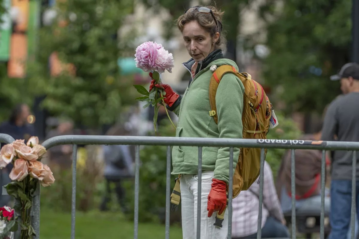 Boulder resident Hanna Rose Shell looks for a spot to place flowers on Pearl Street on Wednesday.