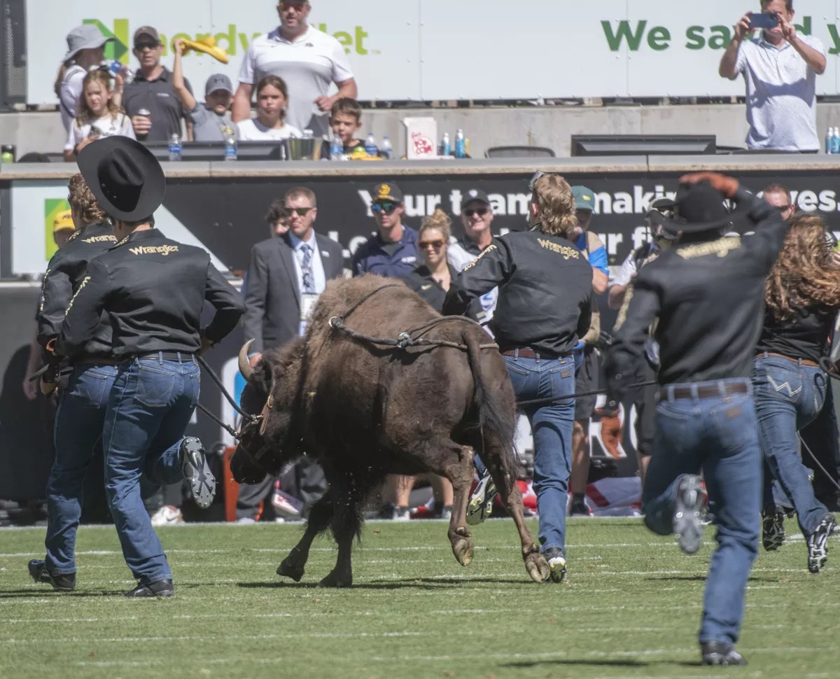 Ms. Ralphie VI leaves the field as the University of Colorado took on Nebraska.