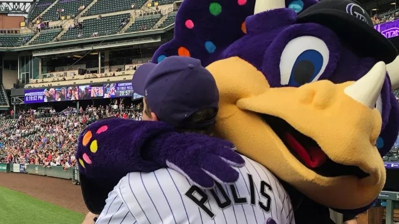 A physical-distancing-free photo of Governor Jared Polis embracing Colorado Rockies mascot Dinger.