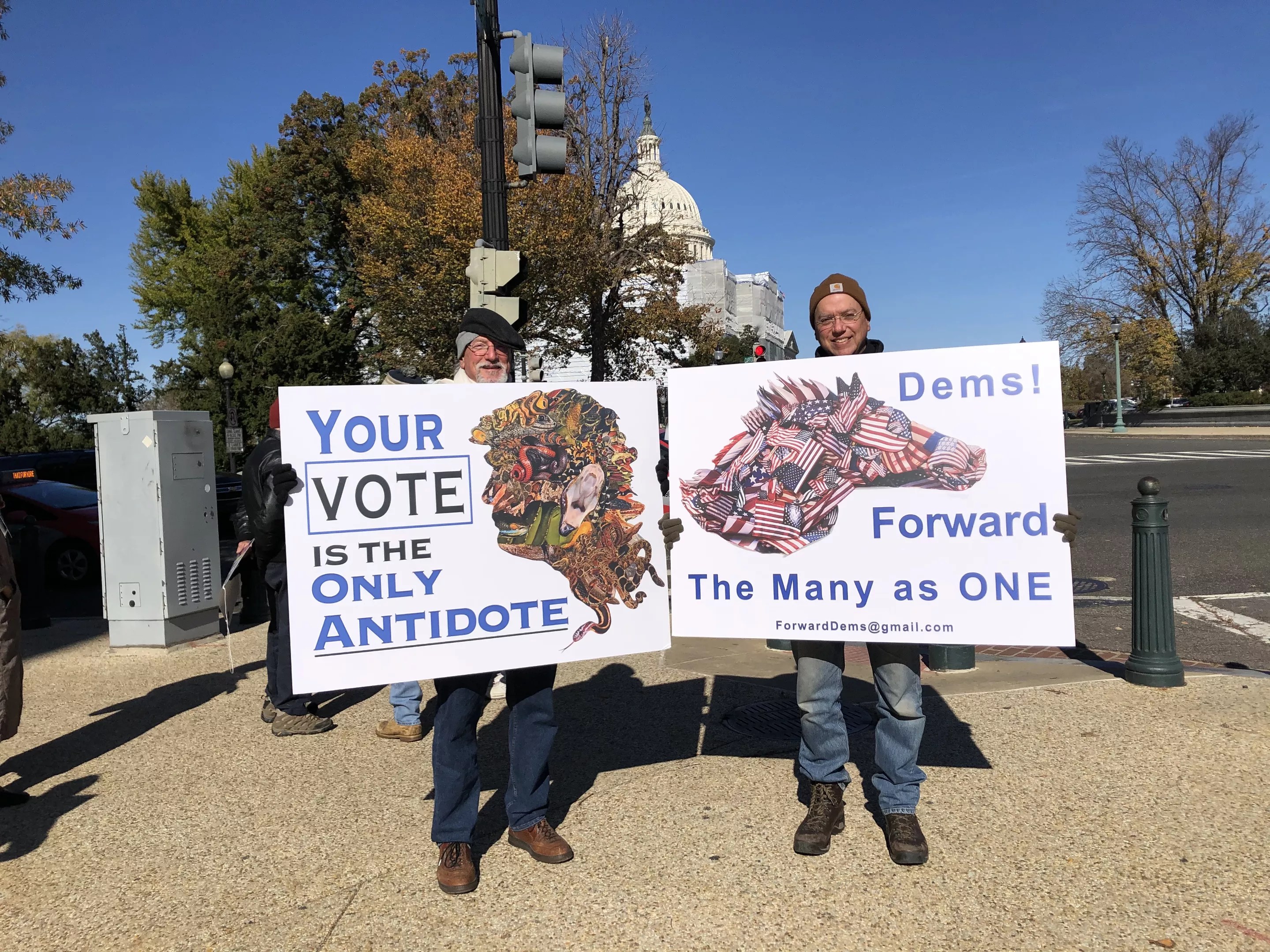 In the months that followed, he ramped up his actions. At one point, he rented trucks to drive around D.C. On the sides, he displayed prints with slogans like “Your Vote Is the Only Antidote,” accompanied by a horse made of flags symbolizing the Democratic Party, standing off against a nightmarish image of Trump. He brought massive helium balloons with slogans on them to the midterm debates. And he started strapping signs to his body and dogging politicians.