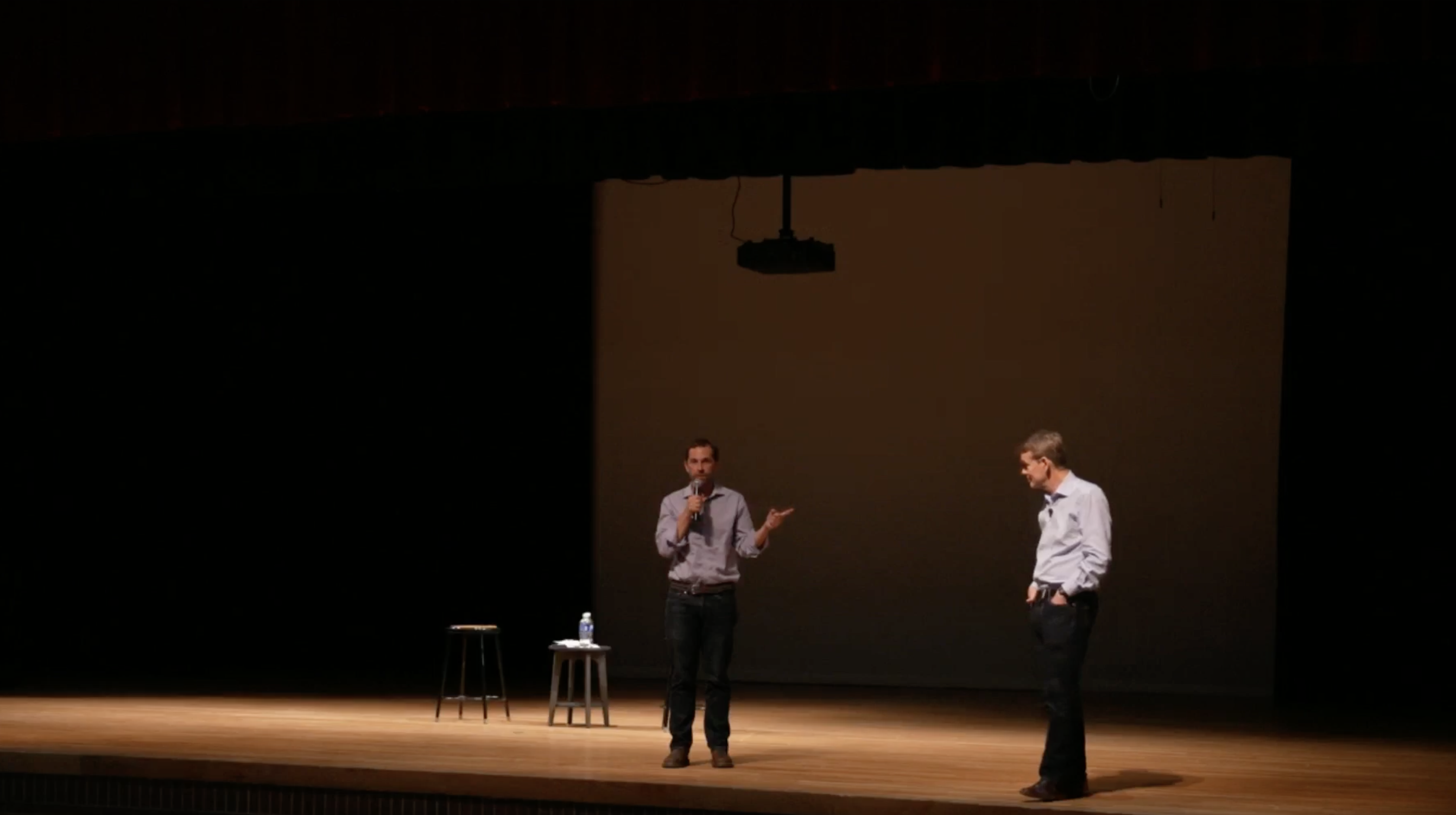 U.S. Representative Jason Crow (left) and U.S. Senator Michael Bennet during the town hall.